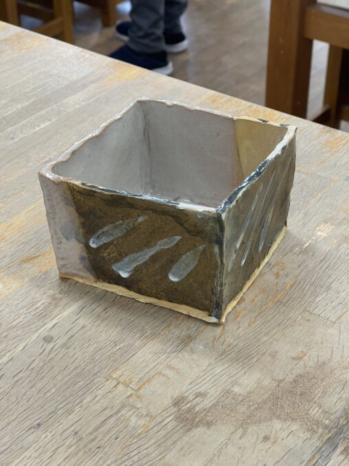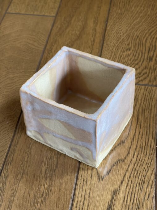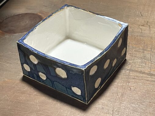 土:京白土+黒泥土釉薬:透明釉、緑青氷裂釉 透明釉の上にスポンジで緑青氷裂釉をポンポンつけたが、よく分からない。溶けて垂れるのを予想して濃いめに乗せるといいかも。