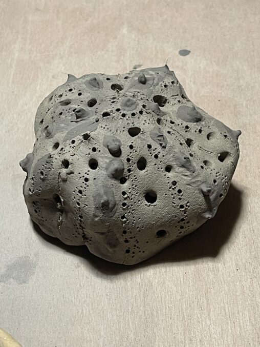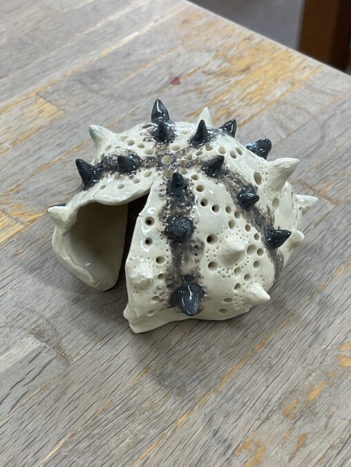 土:信楽特コシ土釉薬:黒天目、酸化ナマコ、透明釉 そのまま乾燥させたので、浮いてしまった。乾燥時にビニールに水入れて重しにするんだそう